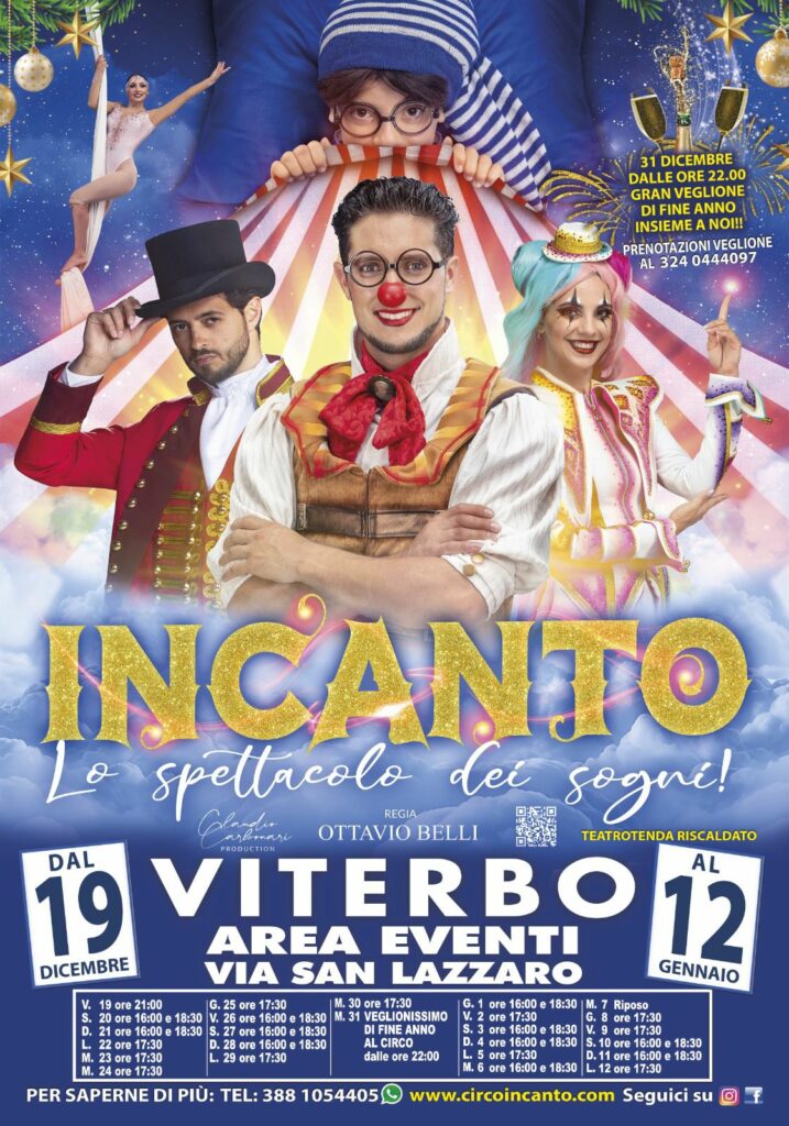 meravigliarsi. Il cast ci aspetta per regalarci le emozioni più belle delle feste, perché Incanto non è un circo tradizionale ma un viaggio fantastico guidato da una compagnia di giovani artisti pluripremiati. In pista non ci sono animali, ma il sogno di Cristian, un bambino di dieci anni che desidera diventare una stella del circo e del varietà. A raccontare la filosofia dello spettacolo è il direttore artistico Claudio Carbonari, che parla di «una forma originale e innovativa di circo contemporaneo», costruita grazie a professionisti che hanno già brillato nei festival più prestigiosi, dal Monte Carlo al Festival Internazionale del Circo d’Italia. Il debutto venerdì 19 alle ore 21. Per un’ora e mezza Incanto trascina il pubblico tra acrobazie sospese, momenti comici, giocoleria, ombre cinesi e atmosfere più intime che invitano a non smettere mai di inseguire i propri sogni. La prima parte rende omaggio alla tradizione, la seconda esplode in un susseguirsi di illusioni e magie fino al grande finale, firmato dalla direzione artistica di Carbonari e dalla regia di Ottavio Belli. A rendere ancora più speciale l’esperienza è il nuovo chapiteau, riscaldato e progettato per trasformare la pista in un palcoscenico immersivo, capace di avvolgere lo spettatore e renderlo parte della storia. Incanto sarà a Viterbo fino al 12 gennaio, con un appuntamento speciale per Capodanno con ingresso alle ore 22, spettacolo, brindisi di mezzanotte e un dj set che trasformerà il tendone in una vera festa. Da non perdere domenica 21 alle ore 11 la Santa Messa, aperta a tutti e celebrata da Padre Tancredi Muccioli, incaricato per la Pastorale dei circensi, un momento di raccoglimento che si affianca alla magia dello show.