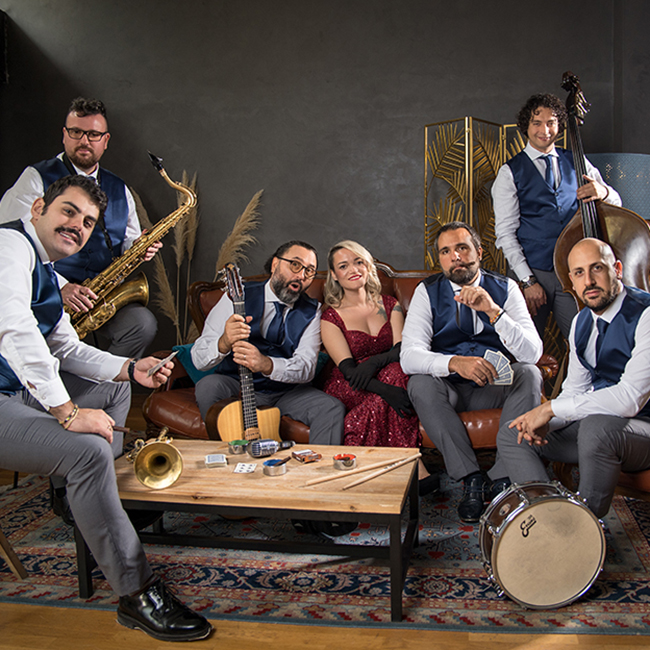 Venerdì 25 luglio, il palco si tinge di nostalgia con i Conosci Mia Cugina?, quintetto romano che ripesca le perle dello swing italiano anni ’30 e ’40, omaggiando il Trio Lescano e Natalino Otto, ma con un tocco contemporaneo che strizza l’occhio al cabaret. La formazione è composta da Federica d’ Andrea voce; Giuseppe Civiletti contrabasso; Davide Annecchiarico pianoforte; Giuseppe Condó batteria e Danilo Raponi sax.