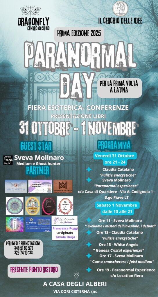 C’è un confine sottile tra ciò che vediamo e ciò che percepiamo. Tra il tangibile e l’invisibile, tra la scienza e il mistero, si apre per la prima volta a Latina un varco affascinante e ricco di suggestioni, il Paranormal Day – Prima Edizione 2025. Il 31 ottobre e il 1° novembre, in un ponte ideale tra Halloween e Ognissanti, la città si prepara ad accogliere un evento inedito, pensato per esplorare il mondo dell’occulto, della spiritualità e dell’energia sottile. Organizzato dal Dragonfly Centro Olistico di Barbara Mantovani e dall’Associazione Culturale Il Cerchio delle Idee guidata da Stefania Mariani, Paranormal Day non è solo una fiera, ma un’esperienza. Una due giorni intensa, pensata per chi ha sete di conoscenza, per chi cerca risposte oltre la superficie, per chi ha il coraggio di fare domande scomode. Ricercatori dell’anima, studiosi del paranormale, amanti dell’esoterismo e semplici curiosi potranno incontrarsi in un contesto protetto, stimolante e aperto alla sperimentazione. Il programma prevede momenti di confronto, conferenze con ospiti di rilievo, esperienze immersive e pratiche guidate. Si parlerà di medium e defunti, di cristalli e vibrazioni, di come riconoscere i falsi e ascoltare l’autentico. Ma soprattutto si condivideranno esperienze, si metteranno in discussione certezze, si lascerà spazio a tutto ciò che la razionalità fatica a spiegare. La notte di Halloween, venerdì 31 ottobre, aprirà le danze con una speciale Paranormal Experience alla Casa di Quartiere di Borgo Piave, un viaggio sensoriale nella percezione del mistero. Guidati da una vera Ghost Hunter, i partecipanti scopriranno l’uso delle attrezzature per la rilevazione di entità paranormali, per poi vivere in prima persona un’immersione nel mondo dell’invisibile. Non uno spettacolo, ma un contatto autentico con l’ignoto. Un evento irripetibile. Il giorno successivo, sabato 1° novembre, la manifestazione si sposterà nella suggestiva A Casa degli Alberi, tra il verde di Via Cori Cisterna, che per l’occasione diventerà un vero e proprio santuario del paranormale, con incontri, talk e spazi dedicati al benessere energetico e alla spiritualità. Tra gli ospiti più attesi, la medium e ghost hunter Sveva Molinaro, pronta a guidare il pubblico attraverso l’invisibile e il gruppo White Angels, con un’esperienza vibrazionale legata alla Genesa Crystal. Ma Paranormal Day sarà anche una piccola fiera tematica, dove trovare artigianato esoterico, editoria di settore, incensi, tarocchi, oggetti magici, e confrontarsi con esperti di divinazione, channeling, aromaterapia e discipline olistiche. «Paranormal Day nasce dal desiderio di creare uno spazio autentico dove spiritualità, ricerca e mistero possano incontrarsi. Insieme ai nostri preziosi partner: White Angels, Andrea Menin, La Lavanda di Mari, Animarcana by Angy, Tiziana Lungo, Maria Victoria Tuan, Maria Elena di Maio, Un Incanto di Cera, Starshop, Francesca Poggi con le sue Tavole Ouija, Sveva Molinaro e Claudia Catalano; vogliamo offrire un’esperienza intensa, ricca di confronto, conoscenza e apertura. È un invito a chi non ha paura di guardare oltre» – hanno dichiarato le organizzatrici Stefania Mariani e Barbara Mantovani. Paranormal Day è molto più di un evento, è un invito ad attraversare le proprie paure, a fare luce sull’ignoto, a riconoscere nel mistero una chiave possibile di lettura del reale. È un progetto culturale che nasce dal territorio ma parla a tutti, senza sensazionalismi, con serietà, passione e desiderio di condividere. Per chi sente che non tutto si può spiegare, ma molto si può comprendere. Tra le proposte che arricchiscono la manifestazione, spicca il corso base di lettura dei Tarocchi, Arcani Maggiori, organizzato da Dragonfly e dall’Associazione Culturale Il Cerchio delle Idee, sarà condotto da Claudia Catalano con il suo metodo originale. Un ciclo di cinque incontri settimanali, ogni martedì a partire dal 4 novembre (ore 20.30–22.30), pensato per chi desidera avvicinarsi in modo serio e strutturato alla lettura simbolica e intuitiva dei Tarocchi. Durante il Paranormal Day sarà possibile iscriversi direttamente al corso, così come partecipare ai suggestivi laboratori di costruzione dell’Acchiappasogni, in cui verranno esplorati intrecci, nodi e significati profondi legati a questa antica arte rituale. L’ingresso è libero ma per le esperienze è richiesta la prenotazione al 348 51 60 571 oppure 329 74 10 133.