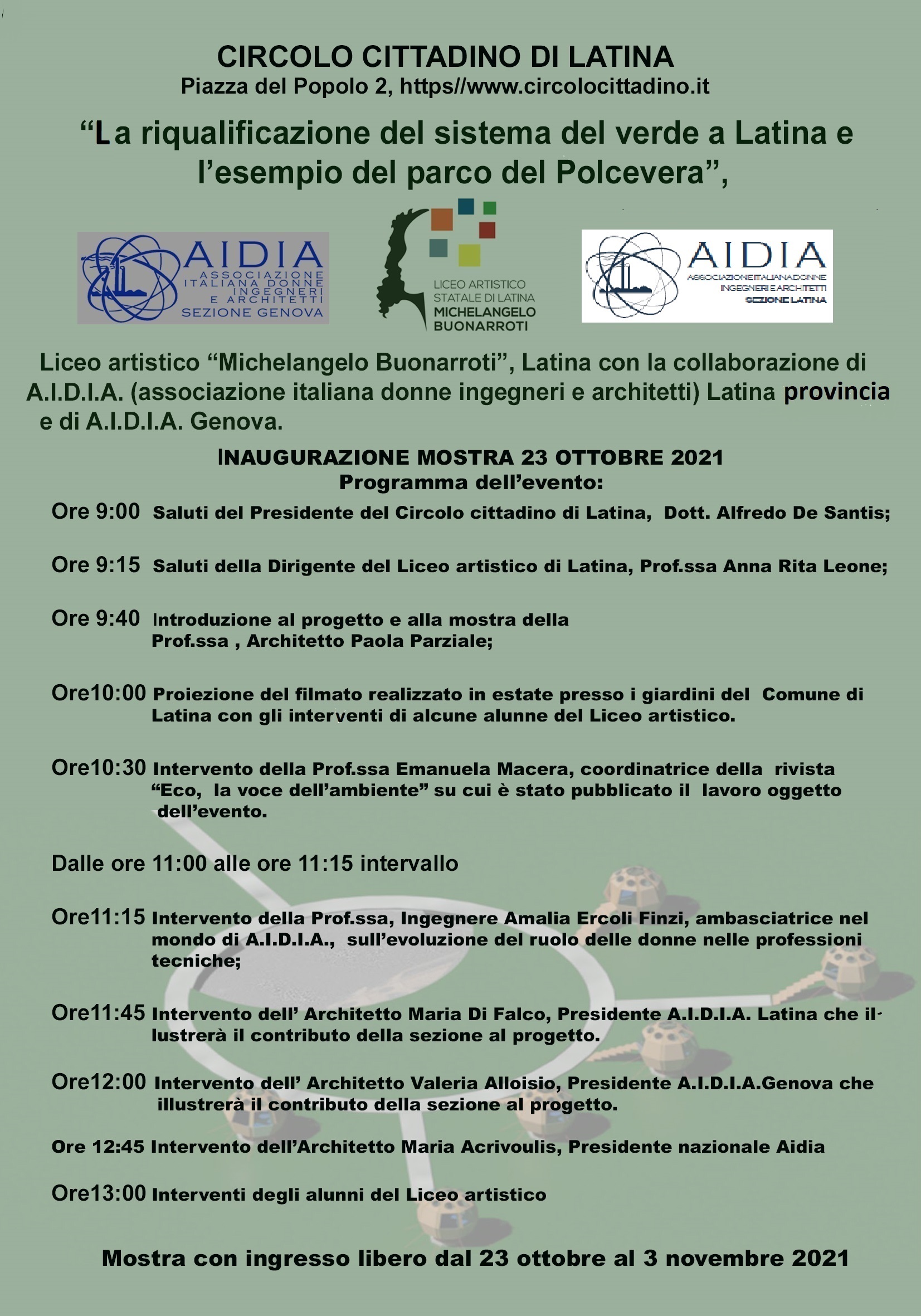 Sabato 23 ottobre, presso l’Auditorium del Circolo cittadino di Latina ,si svolgerà l’inaugurazione della mostra dei ragazzi del Liceo artistico “Michelangelo Buonarroti “sulla “La riqualificazione del sistema del verde a Latina e l’esempio del Parco del Polcevera”, fino al 4 novembre a ingresso gratuito.