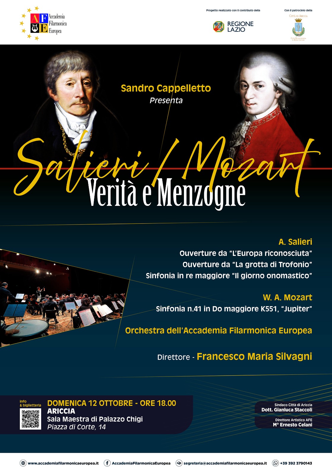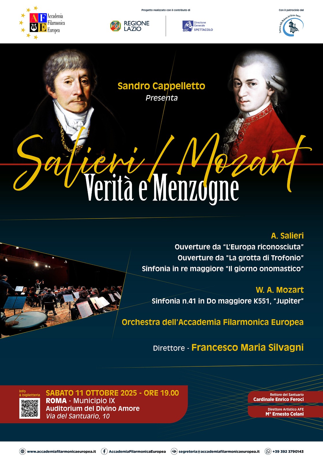 Roma e il Lazio si preparano a un appuntamento che è insieme concerto e racconto, storia e teatro. Parte “Salieri/Mozart. Verità e Menzogne”, la rassegna musicale organizzata dall’Accademia Filarmonica Europea con il contributo della Regione Lazio e del MiC, Direzione Generale Spettacolo. Un ciclo di serate che attraversa luoghi simbolo della cultura, dall’Auditorium del Divino Amore di Roma al Museo delle Navi Romane di Nemi, passando per Ariccia e Montefalco, per restituire al pubblico l’immagine autentica di Antonio Salieri, a 200 anni dalla sua morte, e il suo dialogo, artistico e umano, con Wolfgang Amadeus Mozart. A guidare il pubblico in questo viaggio sarà Sandro Cappelletto, autore, storico della musica e voce tra le più autorevoli della divulgazione musicale italiana. Con la sua profonda competenza e sensibilità teatrale, intreccerà parole e musica per raccontare la complessa vicenda che da più di due secoli avvolge Salieri. Un mito, quello dell’“assassino di Mozart”, alimentato dalla cronaca e dall’arte, dal teatro al cinema. fino a diventare leggenda nera. La rassegna intende rovesciare questo paradigma, Salieri non più figura in ombra, ma protagonista di un’epoca, maestro di Beethoven e Schubert, autore di opere e sinfonie applaudite in tutta Europa. Il programma alterna pagine celeberrime e scoperte sorprendenti: l’Ouverture da L’Europa riconosciuta; l’opera che inaugurò La Scala di Milano nel 1778 e, quella da La grotta di Trofonio, capolavoro di magia e trasformazione, fino alla Sinfonia in re maggiore Il giorno onomastico. In contrappunto, la Sinfonia n.41 in do maggiore K551 “Jupiter” di Mozart, il vertice assoluto del sinfonismo classico, che risuonerà come risposta al mondo di Salieri. Protagonista sul palco sarà l’Orchestra dell’Accademia Filarmonica Europea, diretta dal Maestro Francesco Maria Silvagni, che interpreterà le pagine dei due compositori in un continuo gioco di specchi fra realtà e leggenda. Le date da mettere in agenda: sabato 11 ottobre alle 19.00 all’Auditorium del Divino Amore di Roma, la prima assoluta dei concerti; domenica 12 ottobre alle 18.00 nella Sala Maestra di Palazzo Chigi di Ariccia; sabato 18 ottobre alle 18.00 al Complesso Museale San Francesco di Montefalco (PG); domenica 19 ottobre alle 17.30 al Museo delle Navi Romane di Nemi. La rassegna si concluderà venerdì 24 ottobre alle 19.30 all’Auditorium del Goethe Institut di Roma. Ogni serata non sarà solo concerto, ma un vero e proprio racconto in musica, attraverso le parole di Cappelletto, Salieri torna a parlare in prima persona, con le sue confessioni, i suoi successi, le sue ferite; mentre le note dell’orchestra ne disegnano il ritratto artistico. Sullo sfondo, il genio di Mozart, il mito della Jupiter e la forza di una stagione irripetibile della musica europea. Sono previste agevolazioni per l’acquisto dei biglietti riservate a under 26 e over 65.