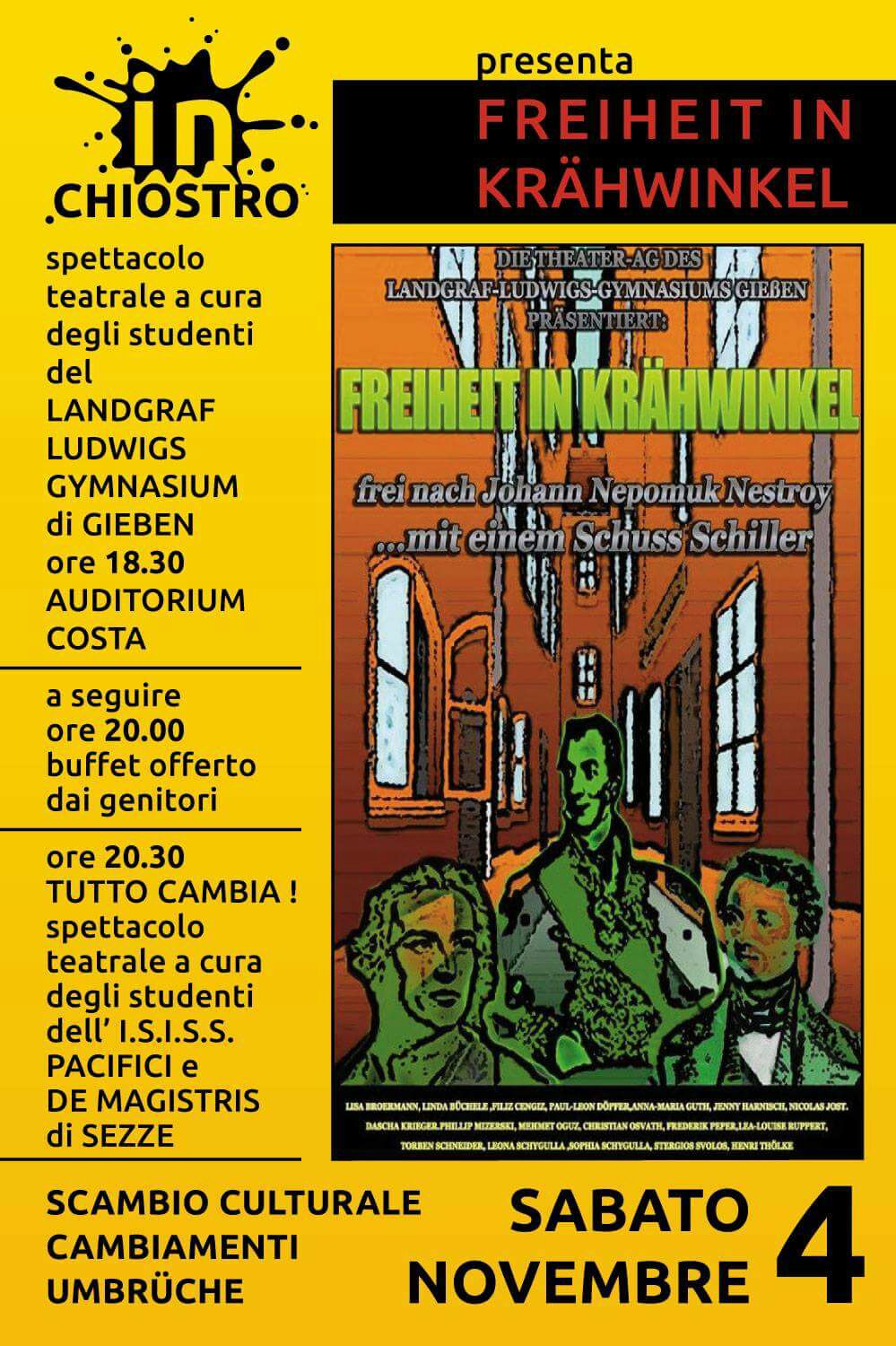 Una rassegna che muove i suoi passi dal mondo della scuola, non poteva non vedere protagonisti gli studenti più di quanto lo siano stati finora. “In-Chiostro, arte ed enogastronomia nel Convento” prosegue nella sua programmazione e per domani 4 novembre attende tutti all’Auditorium Mario Costa di Sezze per un doppio evento, a partire dalle 18.30 e tutti gli spettacoli sono ad ingresso gratuito. Quello in cartellone è uno appuntamento davvero particolare, frutto di un progetto di scambio culturale che va avanti da ben 12 anni e che vede protagonisti gli alunni dell’istituto Pacifici e De Magistris di Sezze e quelli del Landgraf Ludwigs Gymnasium di Gießen (città vicino a Francoforte). Un lavoro che ruota attorno alla magia del teatro e che ogni anno si manifesta in due rappresentazioni teatrali diverse ma accomunate da un unico denominatore, il tema dell’anno: in questo 2017 si parlerà di Cambiamenti/Umbrüche. I ragazzi setini seguiti dal professor Giancarlo Loffarelli (affermato scrittore, regista e attore teatrale, apprezzato anche oltre i confini nazionali) e quelli tedeschi, guidati dal professor Rolf Bernhard, quest’anno accompagnato anche dal professor Klaus Meineke, daranno prova di quanto appreso e prodotto, ognuno nella sua lingua madre. Si inizia alle ore 18.30 con la messa in scena degli ospiti tedeschi dal titolo “Freiheit in krahwinkel” (in lingua tedesca ma sopratitolato in italiano), alle ore 20 pausa gastronomica con un ricco buffet offerto dai genitori degli studenti e poi alle 20.30 gran finale con i giovani attori del Pacifici e De Magistris e i loro “Tutto Cambia”. Un sabato sera diverso, permeato dall’entusiasmo delle nuove generazioni e delle esperienze che stanno vivendo con lo scambio culturale: un arricchimento tout court da condividere con le famiglie e con tutti gli spettatori di “In-Chiostro, arte ed enogastronomia nel convento”. La direzione artistica della rassegna è affidata al professor Luigi Mantuano. Gli spettacoli sono ad ingresso gratuito.