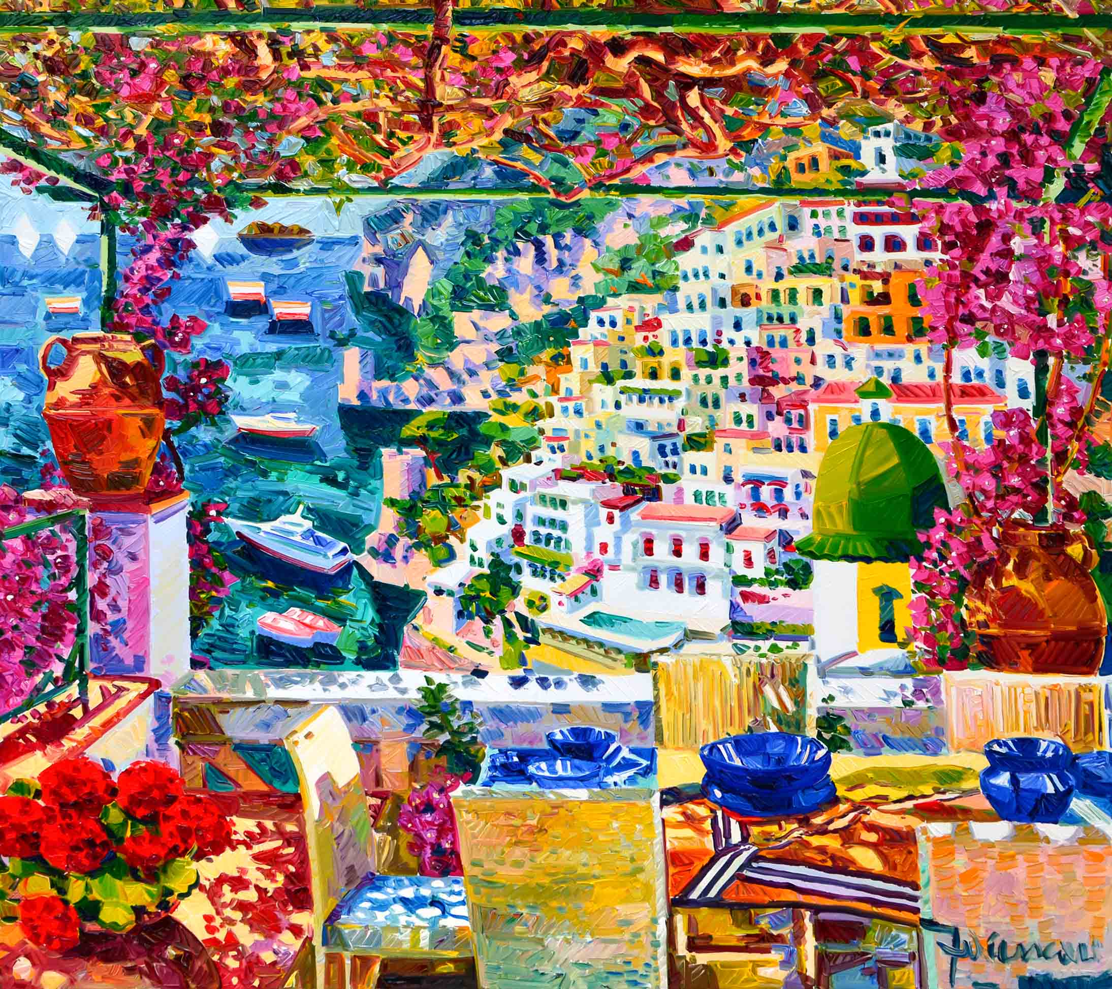 Faccincani è un artista a tutto tondo che è riuscito a conquistare una nutrita schiera di collezionisti e meri amatori della buona arte parlando attraverso le sue opere con un linguaggio cromatico percepibile a tutti. Così Faccincani introduce la sua idea di fare arte, i coloratissimi paesaggi sono una finestra che ci accompagna nella sua immaginazione dove la natura, i paesaggi, le città più belle del mediterraneo vengono rielaborate in base alla sua sensibilità, al suo vissuto, intrise dei suoi desideri futuri e contaminate dal suo stato d’animo. Nativo di Peschiera del Garda negli anni ‘70, Athos Faccincani, dopo aver terminato gli studi fra Venezia e la Lombardia, l’artista si dedica con entusiasmo all’equitazione ed alla pratica della pittura. Partecipa al clima di impegno civile di quegli anni e l’impatto con la realtà sociale e i suoi problemi, il contatto con il mondo delle carceri, degli emarginati e della malavita, lo rendono un sostenitore di chi non ha voce. Così le sue tele, concentrate sull’enigma del sentimento umano con i suoi drammi e le sue contraddizioni, assumono colori melanconici e sofferti nel rappresentare figure intensamente espressive. Da questa ricerca nasce il ciclo di dipinti sulla “Follia delle attese” e sulla Resistenza. Nel 1980, dopo una rigenerazione interiore, Faccincani si rivolge alla natura che ama nella sua totalità e che diventa il suo modello. Muta atteggiamento esistenziale e stilistico e crea immagini di chiara derivazione impressionista, dai colori puri e accesi, dove la luce e il sole, testimoniando gioia e serenità, concorrono al recupero dei valori interiori. Conosciuto e amato ormai anche oltreoceano, tra le sue ultime mostre citiamo quella tenutasi presso la Hyatt Gallery di Tokyo, la partecipazione all’Art Manege di Mosca, la personale a Madrid e nel Principato di Monaco. Innumerevoli anche i premi dei quali è stato insignito durante la sua quarantennale carriera, fra gli ultimi a Roma, come Personalità Europea 2008, ad Ischia il premio Ischia Friends 2010, a Napoli il Premio Albatros ed il Leone d’Argento al Narnia Festival nel 2020.